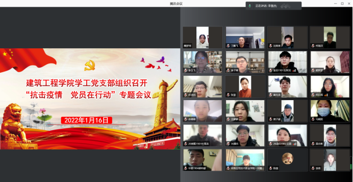 为充分发挥党支部在疫情防控中的战斗堡垒作用,切实发挥支部党员先锋模范作用,建筑工程学院学工党支部于2022年1月16日通过腾讯会议组织召开“抗击疫情,党员在行动”专题会议,支部党员教师、学生预备党员参加本次会议,会议由支部书记马春燕主持。