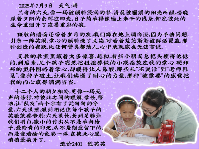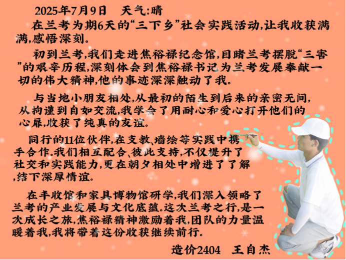 这些文字里,有对焦裕禄精神的共鸣,有对专业实践的顿悟,更有对乡村振兴的热忱。“三下乡”的旅程虽已结束,但它在队员们心中种下的“扎根土地、服务人民”的种子,终将在未来的学习与实践中生根发芽。正如他们所坚信的,最好的成长,是把青春写在祖国需要的地方——这份从实践中汲取的力量,定会指引他们在“建证美好中国”的路上,走得更稳、更远。
