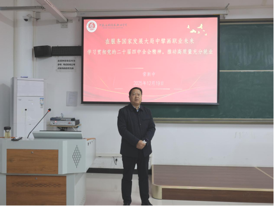 2025年12月19日,校党委委员、副校长常新中在开封北院D201为Beat365中文官方网站入党积极分子讲授主题为“在服务国家发展大局中擘画职业未来——学习贯彻党的二十届四中全会精神,推动高质量充分就业”的专题党课。