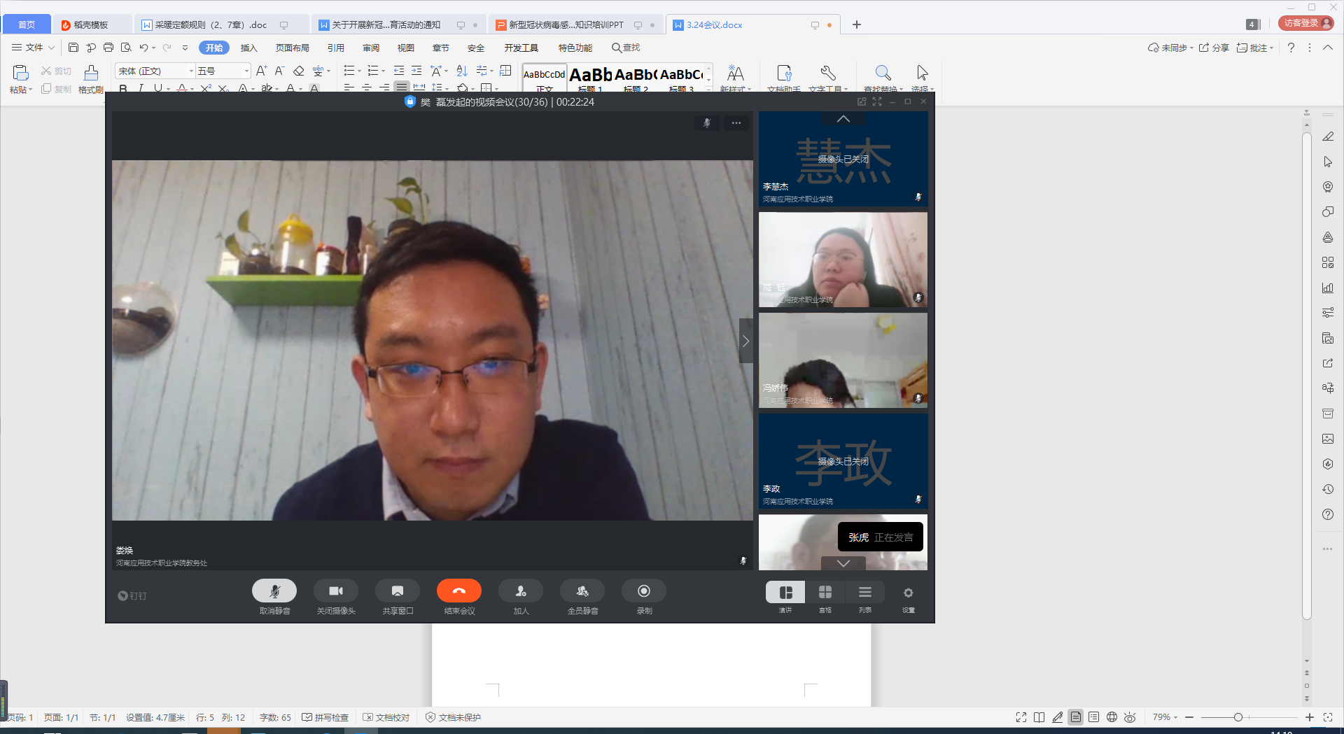 张虎院长做最后总结,指出针对疫情防控工作,一是要高度重视,增强意识,二是疫情防控工作做到全覆盖,全面掌握师生的准确信息,三是加强学生思政教育和爱国主义教育,培养学生树立大局意识,强化学生对“四个意识”“四个自信”“两个维护”的理解和认识,四是多措并举做好疫情防控的宣传工作。