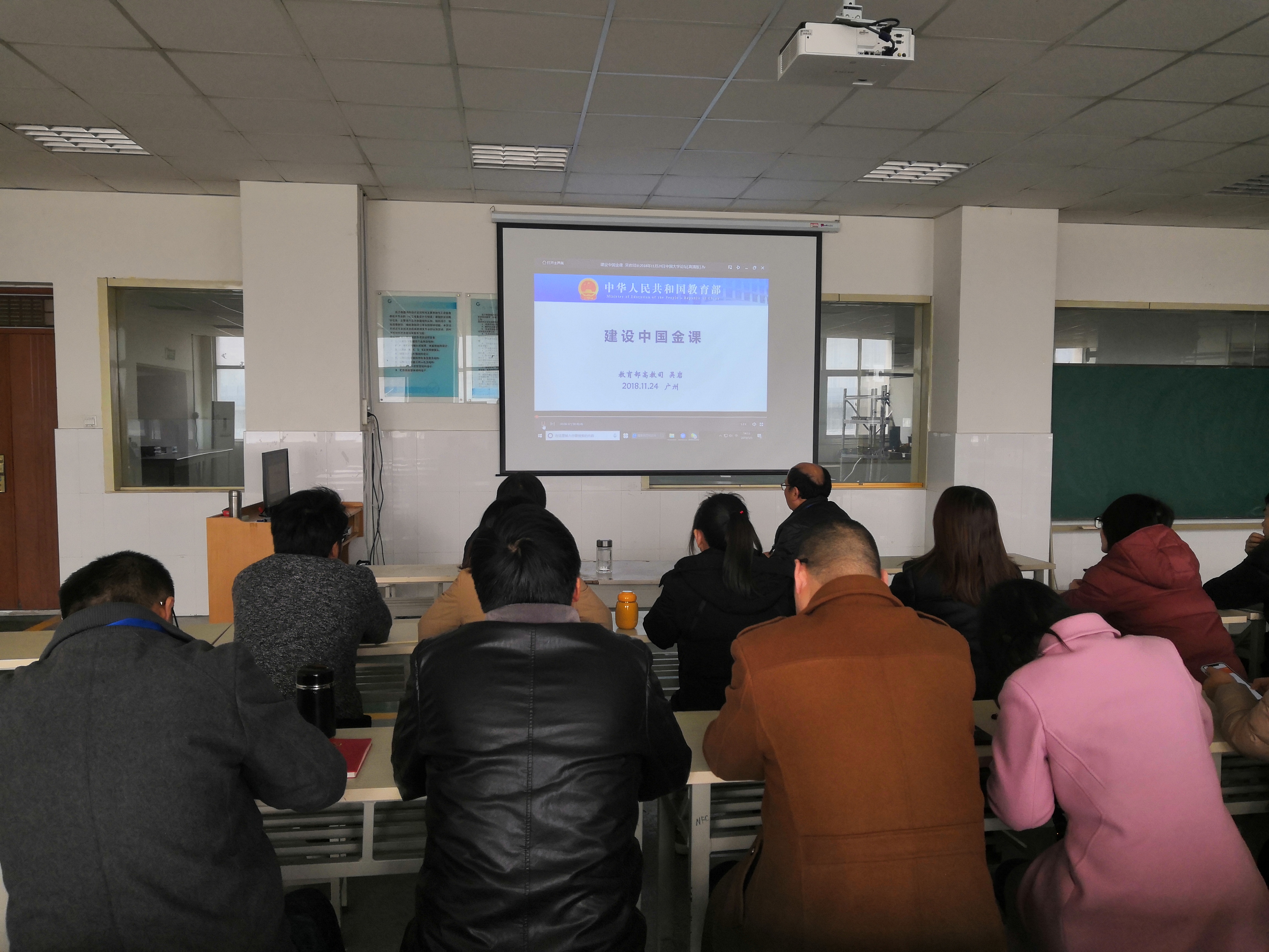 首先,党总支书记张虎带领大家一起观看教育部高教司司长吴岩《打造中国“金课”》讲话录像,学习习近平总书记在全国教育大会上的重要讲话精神,从什么是金课、为什么要建设金课、如何建设金课、“水课”与“金课” 的区别以及五大金课和建设金课的五大保障。