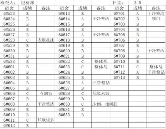 检查结果反映,大多宿舍地面无杂物,房间干净整洁,物品摆放有序。但仍有一部分宿舍存在宿舍违纪,卫生较差等情况。针对存在问题的宿舍,已及时提出整改建议,并叮嘱同学们要勤打扫勤整理,保持好宿舍卫生,共同营造一个干净、舒适的宿舍环境。
