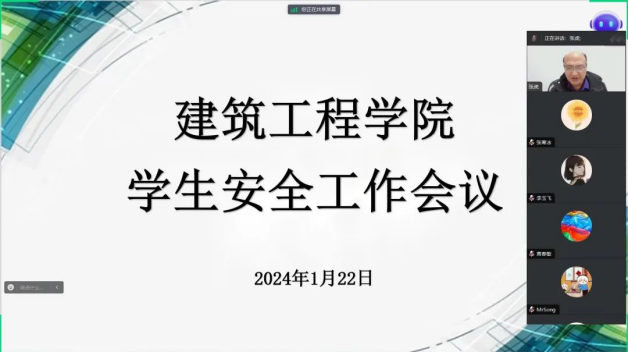 为深入贯彻落实河南省教育厅安全工作会议精神,切实做好学生寒假安全教育管理工作,全面落实安全教育常态化,进一步提高学生安全意识,增强学生安全能力,保障学生安全、平稳、充实地度过假期,2024年1月22日,建筑工程学院召开学生安全工作线上视频会议。本次会议由建筑工程学院党总支书记张虎主持,党总支副书记刘亚娟、团总支书记王莹、党政办主任李慧杰、学工办主任史真以及学院全体专兼职辅导员参加。