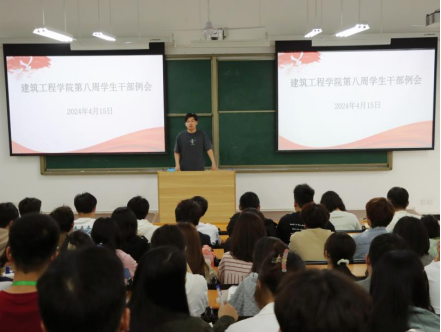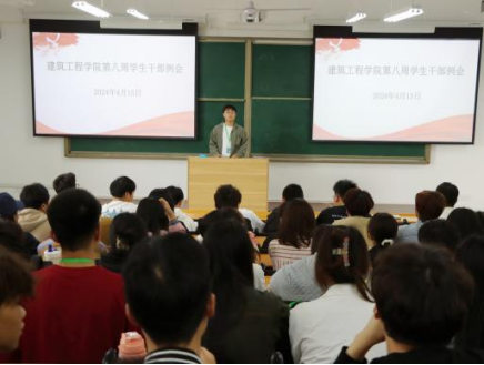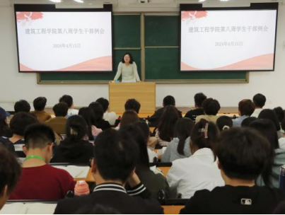 为进一步加强学生干部队伍建设,提高学生自我服务、自我管理、自我教育、自我监督的意识和能力,增进各部门之间的交流,提高工作水平,建筑工程学院于2024年4月15日在开封校区A101教室组织召开第八周学生干部例会。会议由建筑工程学院学工办主任史真主持,全体学生会成员以及各班班长、副班长、团支书参加。