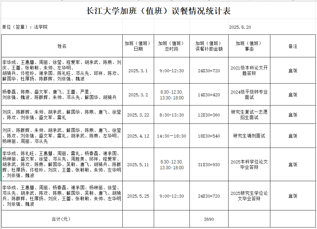 根据《新葡萄8883官网AMG官网加班(值班)误餐补助管理办法(试行)》(长大校发【2019】83号)文件规定,现对新葡萄官网2025年上半年加班(值班)误餐情况进行公示,如对加班(值班)误餐情况有异议,公示期为三天(8月21日-8月23日),请在公示期内向学院办公室(0716-8060329)反映。
