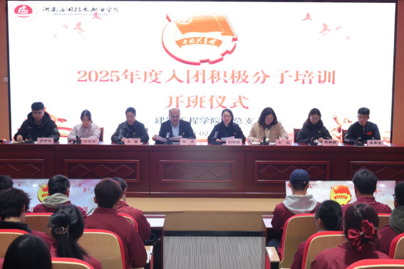 点燃青春火炬,踏上入团新征程。为有效提升入团积极分子的培养教育质量,进一步增强其思想觉悟,增强对团组织的认同感与归属感,培养合格的共青团后备力量,2025年2月24日,建筑工程学院于开封北院D102会议室举行2025年入团积极分子培训班开班仪式。本次会议由建筑工程学院党总支副书记刘亚娟主持,党总支书记张虎、团总支书记王莹、学工办主任史真,辅导员宋雅雯、陈静静、尹宇龙、李希望,以及23、24级全体入团积极分子参与。