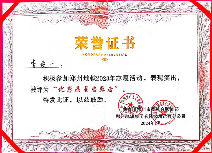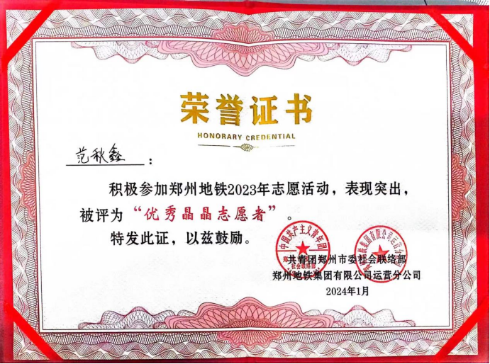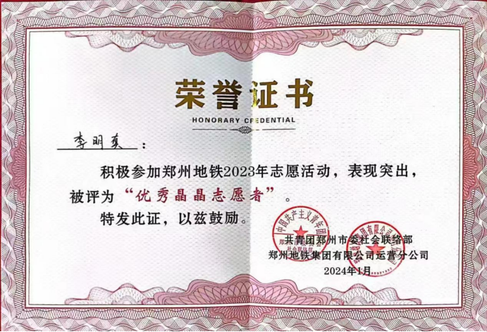 2024年1月11日上午,郑州地铁在紫荆山站负一层举办以“‘晶’彩纷呈,‘晶’心为您”为主题的2023年度“晶晶服务”社会责任报告发布会。Beat365官网建筑工程学院范秋鑫、李明真、李俊一三位同学被授予郑州地铁“优秀晶晶志愿者”称号。