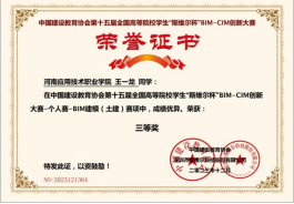 2023年11月 第十五届全国高等院校学生“斯维尔杯”BIM-CIM创新大赛三等奖