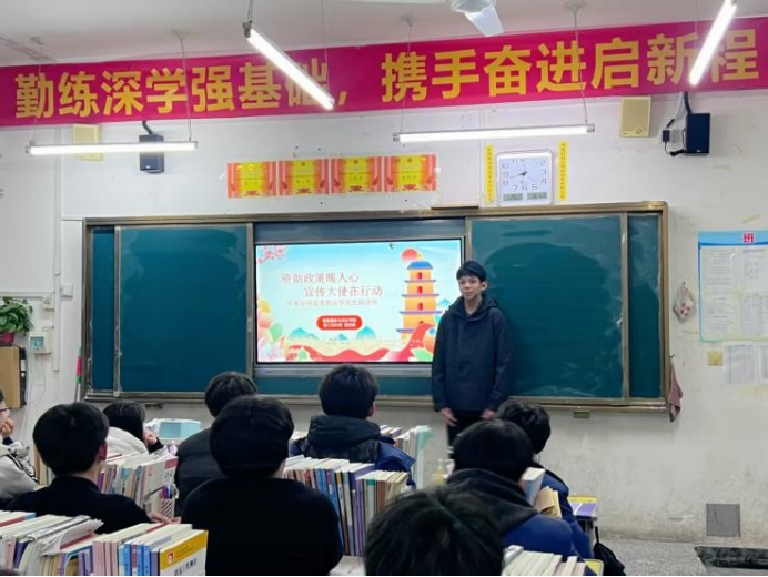2026年1月29日,利用寒假返乡机会,我先后走进母校和所在社区,开展国家资助政策宣传。在长垣职业中等专业学校,我以自身受助经历为切入点,向学弟学妹详细介绍国家助学贷款、国家助学金等资助项目,重点讲解申请条件、办理流程和补助标准。我分享了大学期间依靠国家资助安心学习、成长进步的经历,鼓励他们珍惜机会、坚定信念、追逐梦想。在社区,我通过发放宣传页、现场宣讲、一对一答疑等方式,向居民普及资助政策。我针对性解答家长关心的学费减免、助学贷款申请等问题,用实例展现政策帮扶力度,消除他们的教育成本顾虑,让家长感受到国家对学子的关怀。