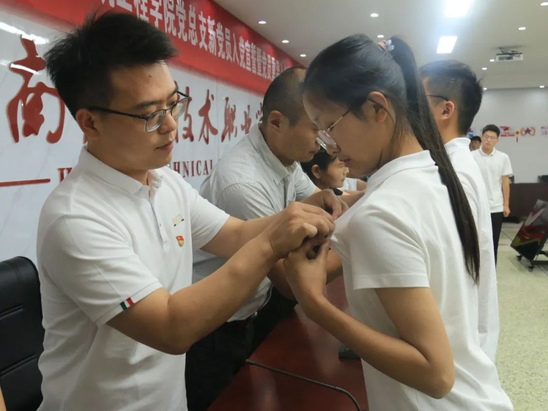 会议进行第二项,学校党委委员薄新党带领老党员们为新党员佩戴党员徽章,并为新党员发放《中国共产党章程》。