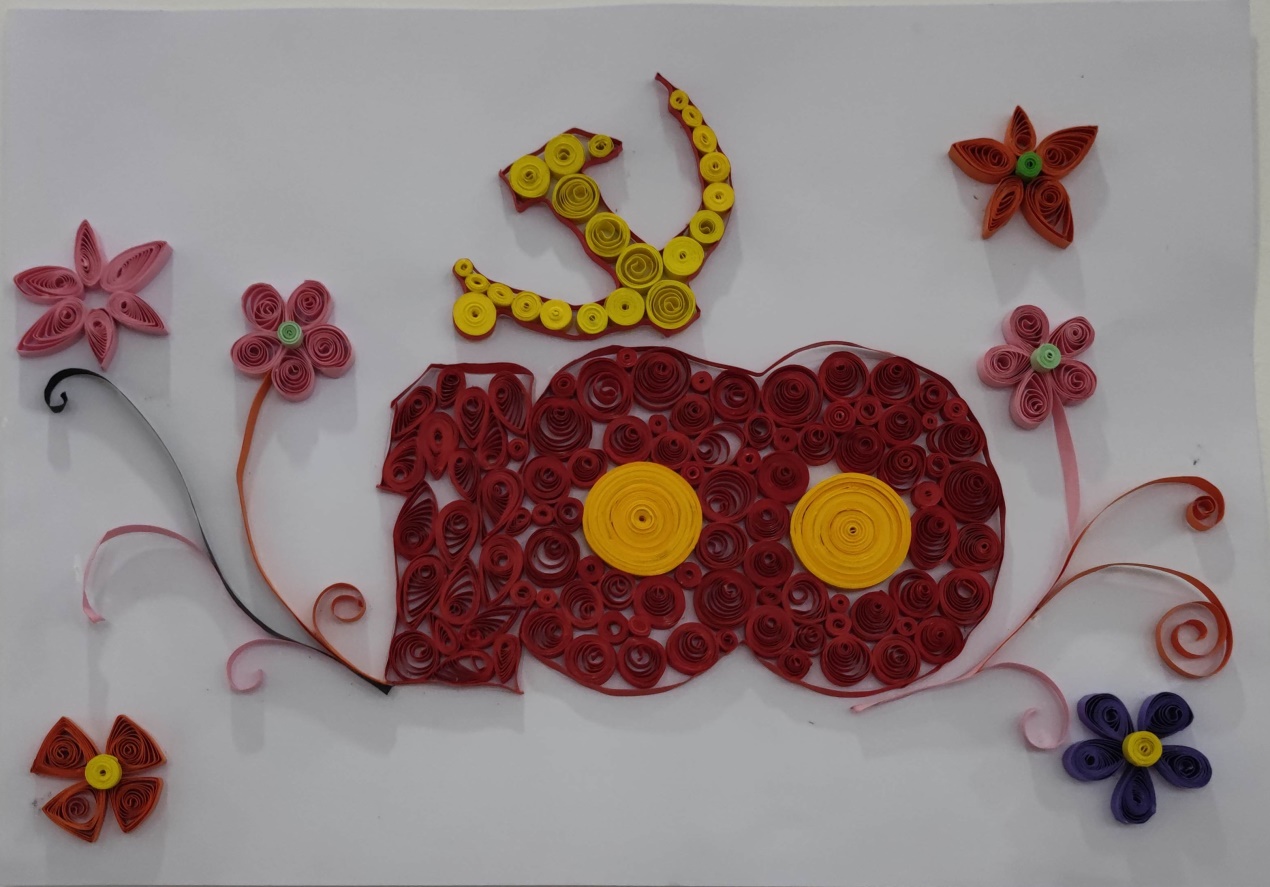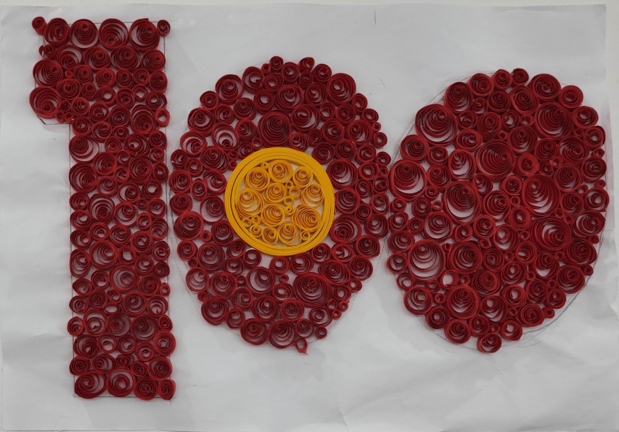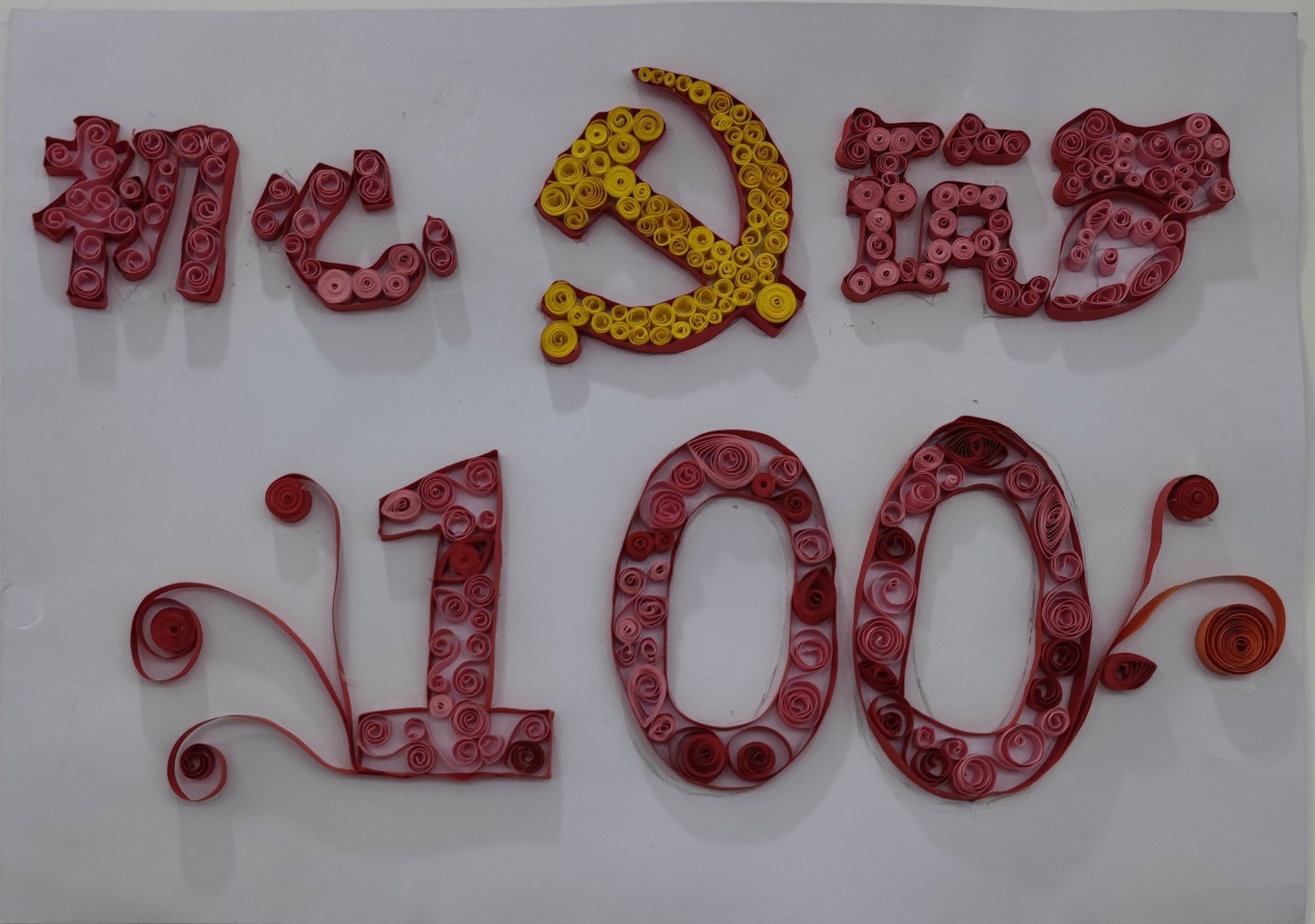 衍纸艺术,被称之为“指尖上的艺术”。它是通过卷曲、弯曲,捏压而形成原始设计形象的一门折纸艺术,非常考验制作者的耐心和动手能力。活动中,大家在衍纸艺术老师的指导下,兴致勃勃地动手制作各自的作品,尽管初次制作,手艺略显生疏,但在众人的通力合作中,以指尖的卷、捏、拼、贴组合,一幅幅幅生动灵巧的“党旗”、“党徽”、建党100周年标识等作品,用红色文艺作品献礼党的百年华诞。