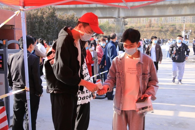 考试期间,考生佩戴口罩,在入校大门处进行体温检测,依据个人绿色健康码有序排队入校。从进校到考场,沿途多处设立提示牌,志愿服务引导员随处可见。从考生进校门、现场信息确认、考生进考场大楼到进考场,整个考区各项工作井然有序、有条不紊进行。