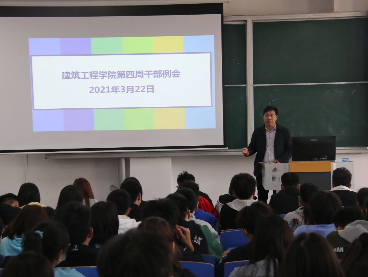 为提高小筑们的积极性,提升工作和学习的效率,建筑工程学院于2021年3月22日中午12:30,在B楼102教室召开了建筑工程学院第四周学生干部例会,(东校区以视频会议方式参加),参与本次会议的有刘高喜老师、李慧杰老师、孙雪理老师、团学会全体成员、入党积极分子及各班班长、团支书。会议开始,刘高喜老师强调,春季是流行病高发季节,大家要多参加校园活动,多锻炼,提高自身素质,宿舍要保持内务整洁,及时通风,预防传染性疾病发生。