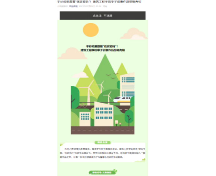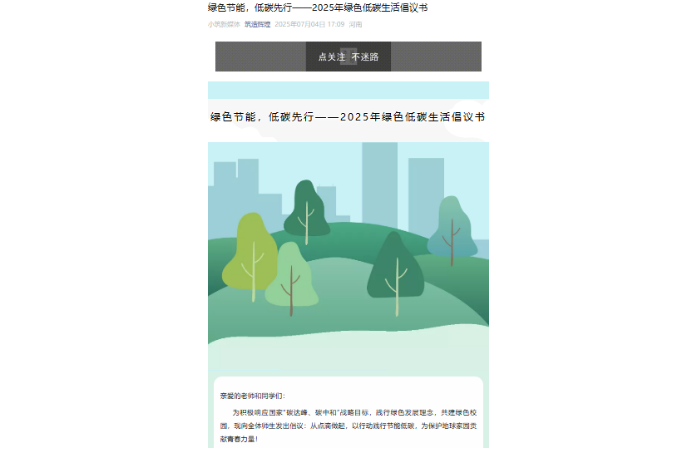 为全面深入贯彻习近平生态文明思想,完整、准确、全面贯彻新发展理念和党中央关于绿色低碳发展的战略部署,充分发挥政治引领作用,引导广大师生将低碳理念融入日常、转化为自觉行动。活动期间,学院以公众号“筑造辉煌”为核心传播载体,持续推送节能知识与低碳生活指南,聚焦“随手关灯、节约用电”“无纸化办公、减少耗材”“垃圾分类、资源循环”等实用技巧开展重点普及。通过常态化宣传引导与“节能低碳,你我同行”的倡议号召,推动全体师生从“被动遵守”转向“主动参与”,为践行“双碳”目标凝聚起学院的集体力量。