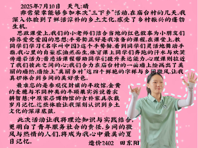 这些来自实践一线的心声,是青春与乡土碰撞出的火花,是理论与实践交融后的顿悟。无论是对专业价值的再认识,还是对责任担当的深刻体会,都让“三下乡”的意义超越了旅程本身。当这份经历化作前行的底气,当乡土的温度融入成长的轨迹,建工学子们终将带着这份赤子之心,在“见证美好中国”的路上,把每一份感悟都变成脚踏实地的力量,让青春在服务社会的实践中绽放更持久的光芒。